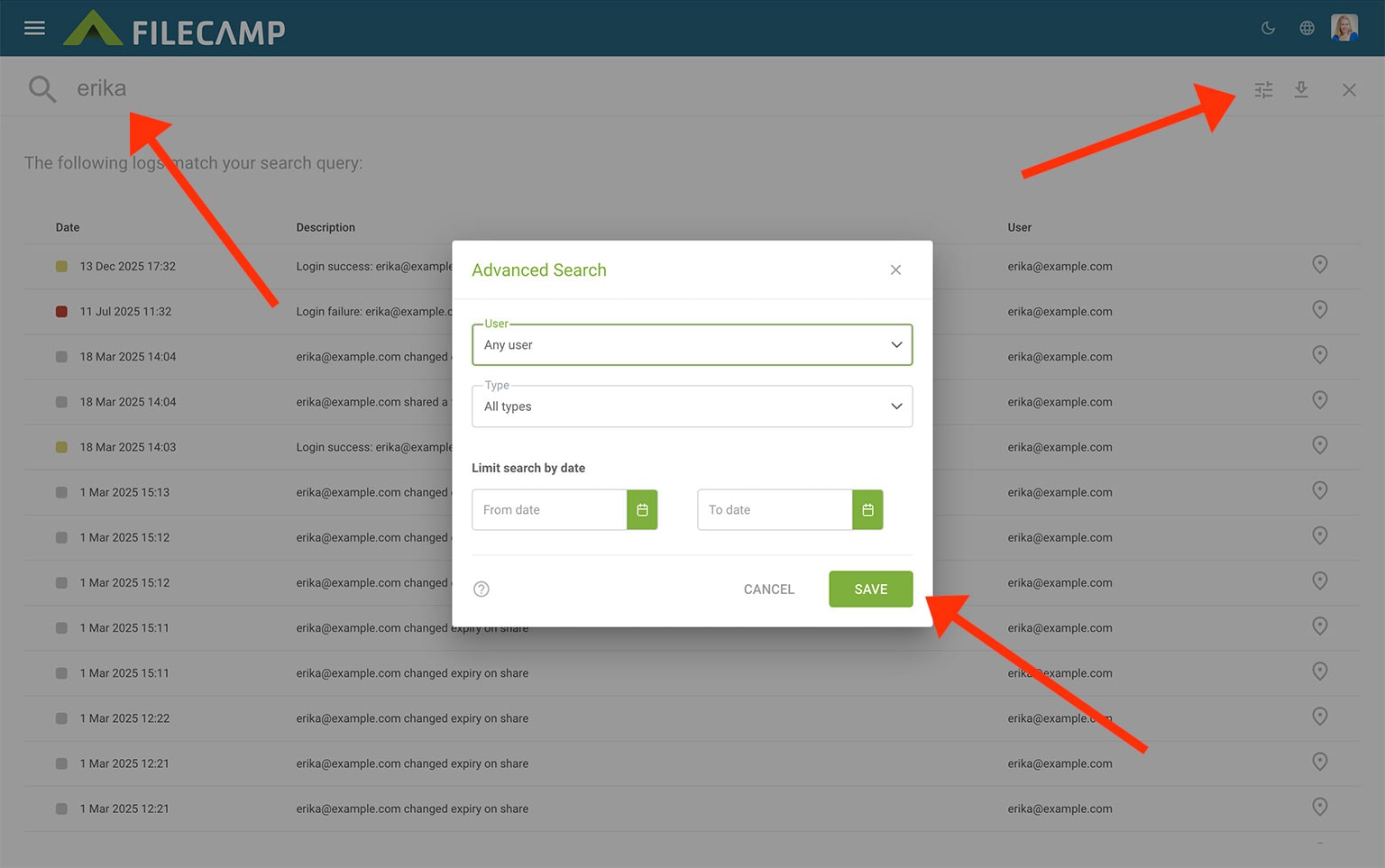 Click on the Search icon and search for specific Log types, User tasks, or define a time period you wish to review more closely. This is useful when you want a more detailed overview of the activity on your account or to view older log entries, you can easily search using the Search log entries function.