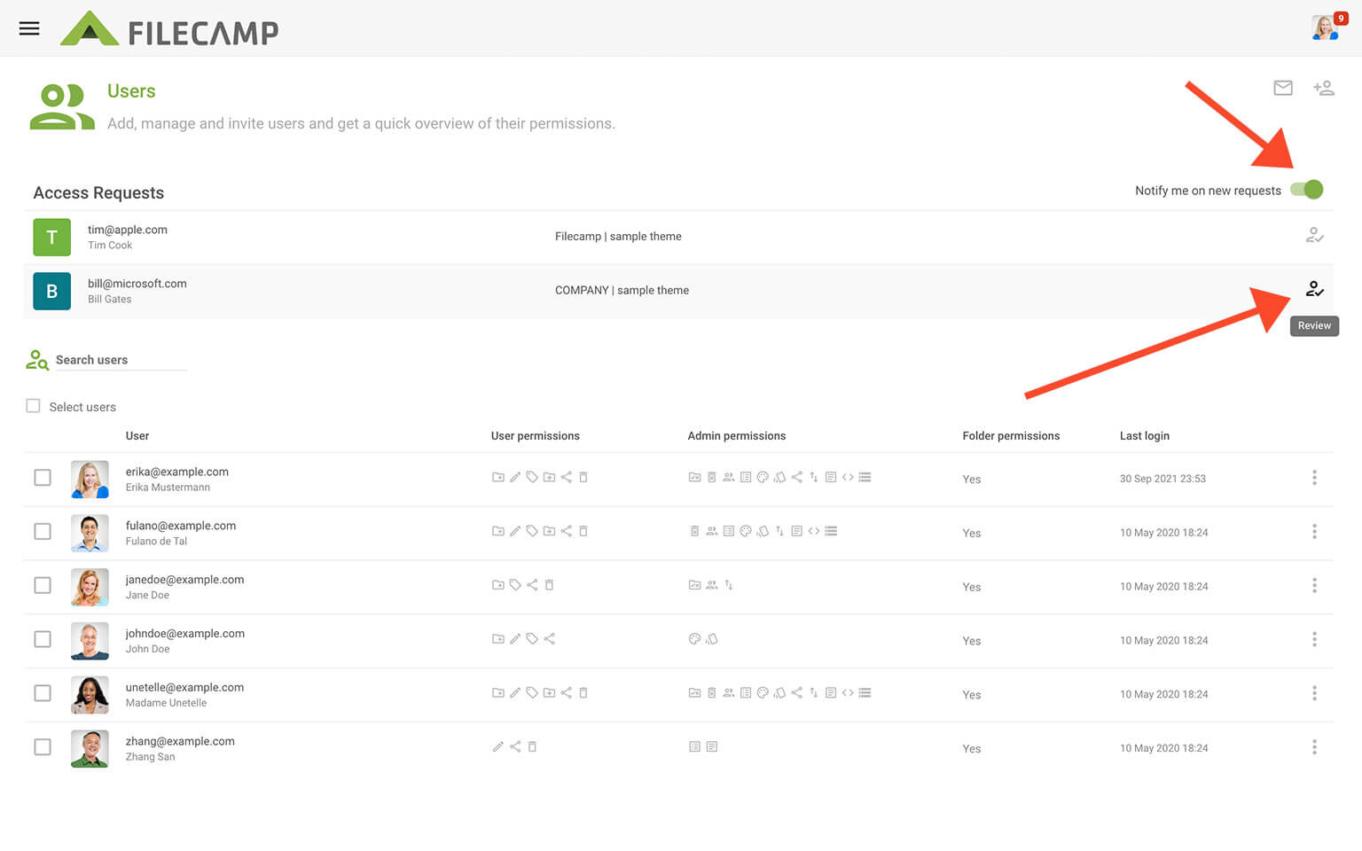 Bulk add & Invite users is a great way to automate access for a whole bunch of people in one go, but fails to handle ongoing access requests from your external partners. Filecamp's Access Requests feature (Pro plan only) relieves some of the headaches for dealing with such requests.