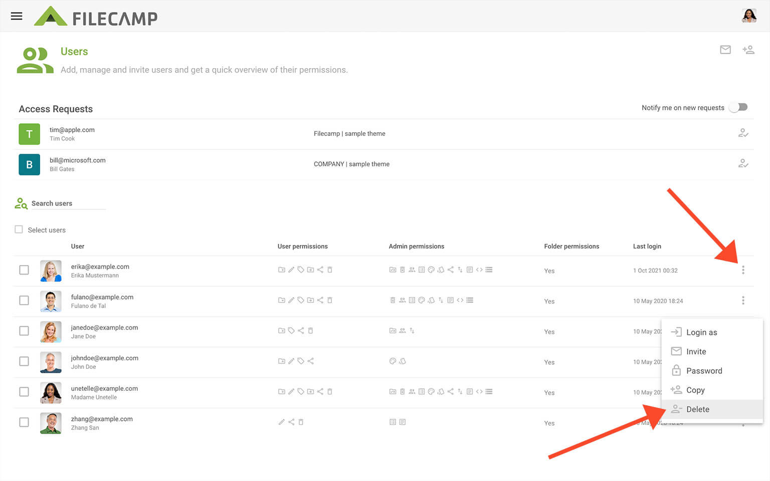Administrators and users with permission to "Manage users" can add, invite and manage users. You can control folder permissions, ensuring users access only the files and folders you want them to access.